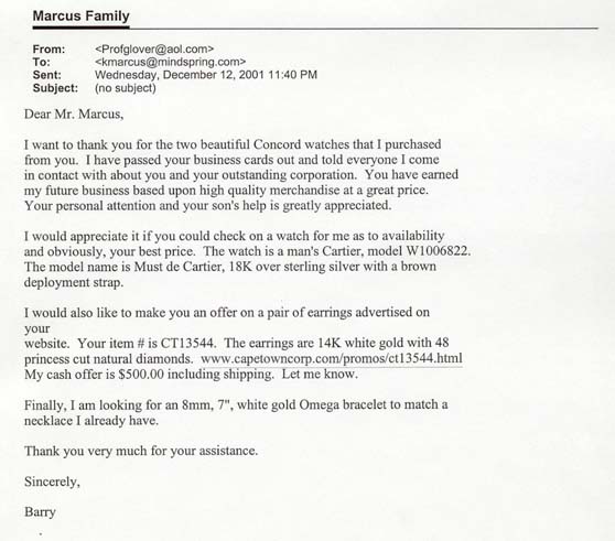 ![]() | Dear Mr. Marcus I want to thank you for the two beautiful Concord watches that I purchased from you. I have passed your business cards out and told everyone I come in contact with about you and your outstanding corporation. You have earned my future business based upon high quality merchandise at a great price. Your personal attention and your son's help is greatly appreciated. I would appreciate it if you could check on a watch for me as to availability and obviously, your best price. The watch is a man's Cartier, model W1006822. The model name is Must de Cartier, 18K over sterling silver with a brown deployment strap. I would also like to make you an offer on a pair of earrings advertised on your website. Your item # is CT13544. The earrings are 14K white gold with 48 princess cut natural diamonds. www.capetowndiamond.com/promos/ct13544.html My cash offer is $500.00 including shipping. Let me know. Finally, I am looking for an 8mm, 7", white gold Omega bracelet to match a necklace I already have. Thank you very much for your assistance. Sincerely,