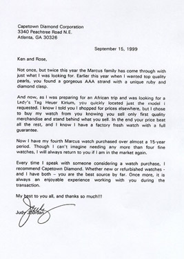 ![]() | September 15, 1999 Ken and Rose, Not once, but twice this year the Marcus family has come through with just what I was looking for. Earlier this year when I wanted top quality pearls, you found a gorgeous AAA strand with a unique ruby and diamond clasp. And now, as I was preparing for an African trip and was looking for a Lady's Tag Heuer Kirium, you quickly located just the model I requested. Now I have my fourth Marcus watch purchase over almost a 15-year period. Though I can't imagine needing any more than four fine watches, I will always return to you if I am in the market again. My best to you all, and thanks so much!!! Judy Jourdan |