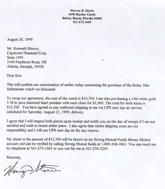 ![]() | August 20, 1999 Dear Ken: This will confirm our conversation of earlier today concerning the purchase of the Rolex 18Kt Submariner watch we discussed. To recap our agreement, the cost of the watch is $10,700. You have agreed to pay outbound shipping to me via UPS next day air service scheduled for Saturday, August 21, delivery. I agree that I will inspect both pieces upon receipt and notify you on the day of receipt if I am not satisfied and wish to return either piece. I also agree that return shipping costs are my responsibility and I will use UPS next day air for any returns. Sincerely, Harvey D. Starin |