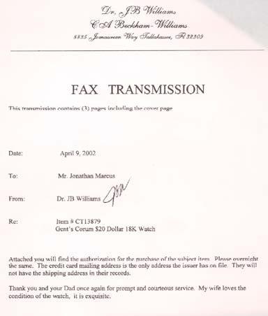 Attached you will find the authorization for the purchase of the subject item. please overnight the same. The credit card mailing address is the only address the issuer has on file. They will not have the shipping address in their records. Thank you and your Dad once again for prompt and courteous service. My wife loves the condition of the watch, it is exquisite.