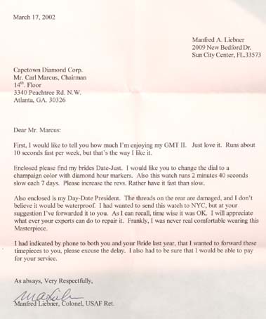Dear Mr. Marcus: First, I would like to tell you how much I'm enjoying my GMT II. Just love it. Runs about 10 seconds fast per week, but that's the way I like it. Enclosed please find my bride's Datejust. I would like you to change the dial to a champagne color with diamond hour markers. Also this watch runs 2 minutes 40 seconds slow each 7 days. Please increase the revs. Rather have it fast than slow. Also enclosed is my Day-Date President. The threads on the rear are damaged, and I don't believe it would be waterproof. I had wanted to send this watch to NYC, but at your suggestion I've forwarded it to you. As I can recall, time wise it was OK. I will appreciate whatever your experts can do to repair it. Frankly, I was never comfortable wearing this Masterpiece. I had indicated by phone to both you and your Bride last year, that I wanted to forward these timepieces to you, please excuse the delay. I also had to be sure that I would be able to pay for your service.