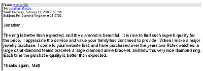 February 12, 2004 Jonathan, The ring is better than expected, and the diamond is beautiful. It is rare to find such superb quality for the price. I appreciate the service and value your family has continued to provide. When I make a major jewelry purchase, I come to your website first, and have purchased over the years two Rolex watches, a large carat diamond tennis bracelet, a large diamond ankle bracelet, and now this very nice diamond ring. Each time the purchase quality is better than expected. Thanks again, Matt