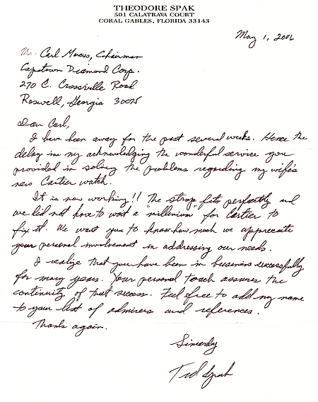 Dear Carl, I have been away for the past several weeks. Hence the delay in my acknowledging the wonderful service you provided in solving the problems regarding my wife's new Cartier watch. It is now working!! The strap fits perfectly and we did not have to wait a "millenium" for Cartier to fix it. We want you to know how much we appreciate your personal involvement in addressing our needs. I realize that you have been in business successfully for many years. Your personal touch assures the continuity of that success. Feel free to add my anme to your list of admirers and references. Thanks again. Sincerely Ted Spak |