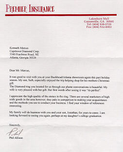 Dear Mr. Marcus It was good to visit with you at your Buckhead/Atlanta showroom again this past holiday season. My son, Seth, especially enjoyed the trip helping shop for his mother's Christmas gift. The Diamond ring you located for us through our phone conversations is beautiful. My wife is very pleased with her gift. Her first words after seeing it was "it's perfect". My family will do business with you and your son, Jonathan, for years to come. I am looking forward to seeing you again, perhaps at my daughter's college graduation. Sincerely, Phil Allison