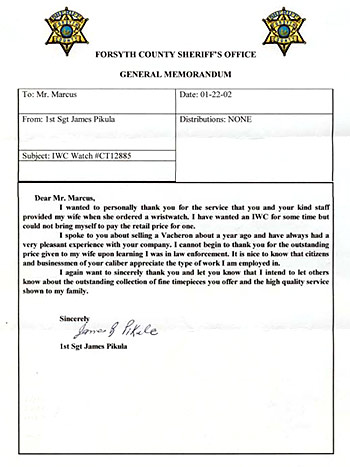 ![]() | Dear Mr. Marcus, I wanted to personally thank you for the service that you and your kind staff provided my wife when she ordered a wristwatch. I have wanted an IWC for some time, but could not bring myself to pay the retail price for one. I spoke to you about selling a Vacheron about a year ago and have always had a very pleasant experience with your company. I cannot begin to thank you for the outstanding price given to my wife upon learning I was in law enforcement. It is nice to know that citizens and businessmen of your caliber appreciate the type of work I am employed in. I again want to sincerely thank you and let you know that I intend to let others know about the outstanding collection of fine timepieces you offer and the high quality service shown to my family. Sincerely,