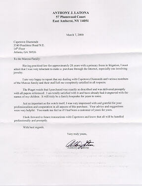 ![]() | March 7, 2000 To the Marcus Family: Having practiced law for approximately 28 years with a primary focus in litigation, I must admit that I was very reluctant to make a purchase through the Internet, especially one involving jewelry. I am very happy to report that my dealing with Capetown Diamonds and various members of the Marcus family and their staff left me completely satisfied in all respects. The Piaget watch that I purchased was exactly as described and was delivered promptly with all papers referenced. I am totally satisfied with it and have already had it engraved with the names of my children. It will truly be a family keepsake for years to come. I look forward to future transactions with Capetown and know that all will be handled professionally and promptly. Anthony J. Latona |