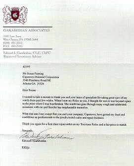 Dear Susan: I wanted to take a minute to thank you and your team of specialists for taking great care of my watch these past few weeks. When I sent my Rolex to you, I thought for sure it was beyond repair to the point where I was heartbroken. The watch has gone through many rough and celebrated occasions with me and therefore has irreplaceable memories. What else can I say except that you and your company, Capetown, have gained my trust and confidence as professionals in the jewelry/watch sales and repair business. Sincerely, |