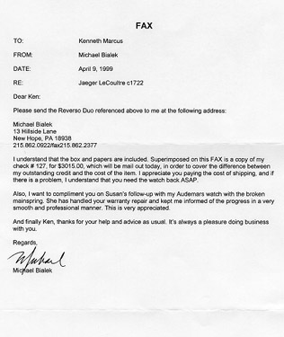 ![]() | April 9, 1999 Dear Ken: Please send the Reverso Duo referenced above to me at the following address: I understand that the box and papers are included. Superimposed on this FAX is a copy of my check for $3015.00, which will be mailed out today, in order to cover the difference between my outstanding credit and the cost of the item. Also, I want to compliment you on Susan's follow-up with my Audemars watch with the broken mainspring. She has handled your warranty repair and kept me informed of the progress in a very smooth and professional manner. This is very appreciated. Regards, |